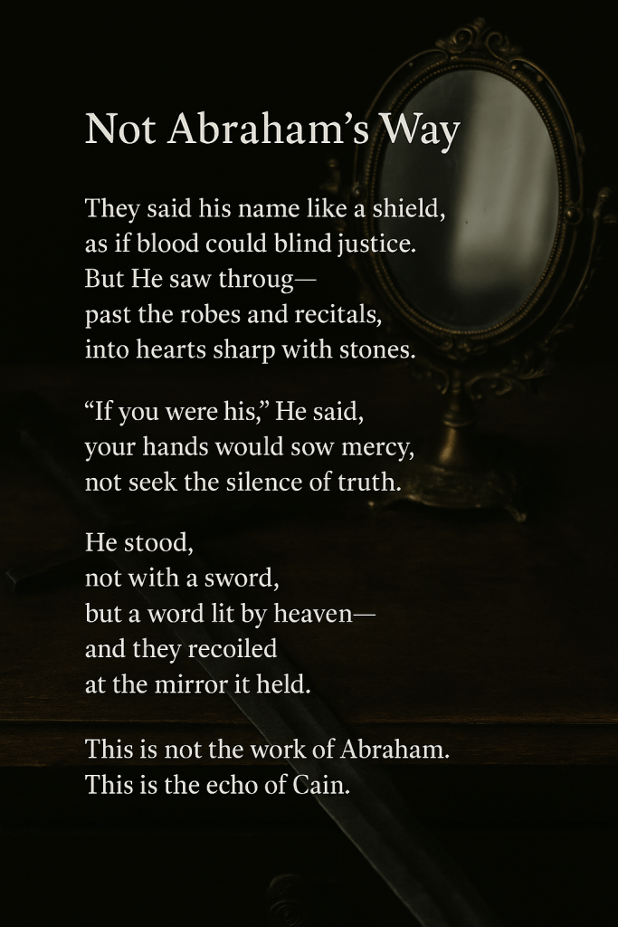 Jesus directly confronts the dissonance between lineage and living. He challenges the crowd’s claim to Abrahamic heritage, not by disputing their ancestry, but by exposing the contradiction in their actions: they claim Abraham as their father yet plot to kill the one who speaks truth from God. Jesus draws a line between biological descent and spiritual inheritance, between having Abraham’s blood and embodying his faithfulness.