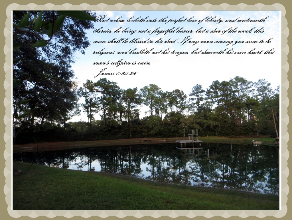 But whoso looketh into the perfect law of liberty, and continueth therein, he being not a forgetful hearer, but a doer of the work, this man shall be blessed in his deed. If any man among you seem to be religious, and bridleth not his tongue, but deceiveth his own heart, this man’s religion is vain.