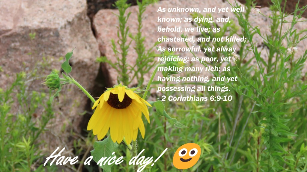 As unknown, and yet well known; as dying, and, behold, we live; as chastened, and not killed; As sorrowful, yet alway rejoicing; as poor, yet making many rich; as having nothing, and yet possessing all things.