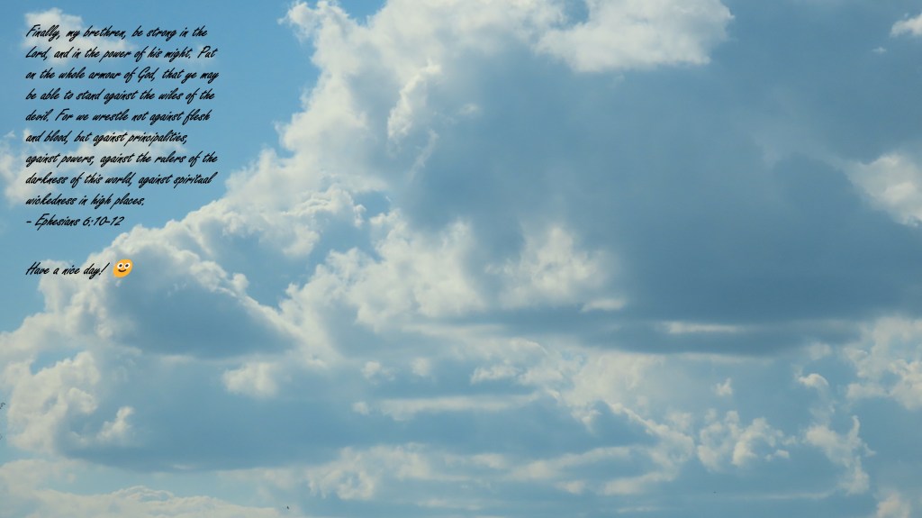 Finally, my brethren, be strong in the Lord, and in the power of his might. Put on the Whole Armor of God, that ye may be able to stand against the wiles of the devil. For we wrestle not against flesh and blood, but against principalities, against powers, against the rulers of the darkness of this world, against spiritual wickedness in high places.