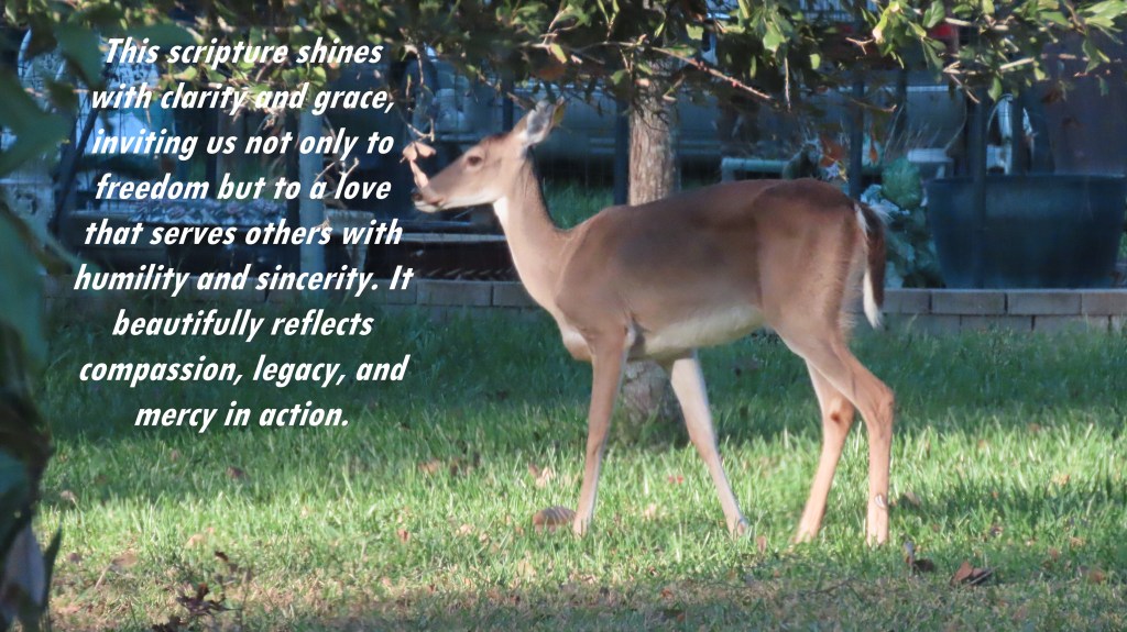 This scripture shines with clarity and grace, inviting us not only to freedom but to a love that serves others with humility and sincerity. It beautifully reflects compassion, legacy, and mercy in action.