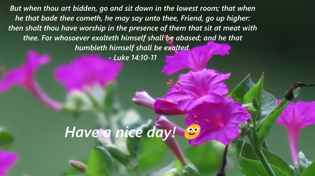 But when thou art bidden, go and sit down in the lowest room; that when he that bade thee cometh, he may say unto thee, Friend, go up higher: then shalt thou have worship in the presence of them that sit at meat with thee. For whosoever exalteth himself shall be abased; and he that humbleth himself shall be exalted.