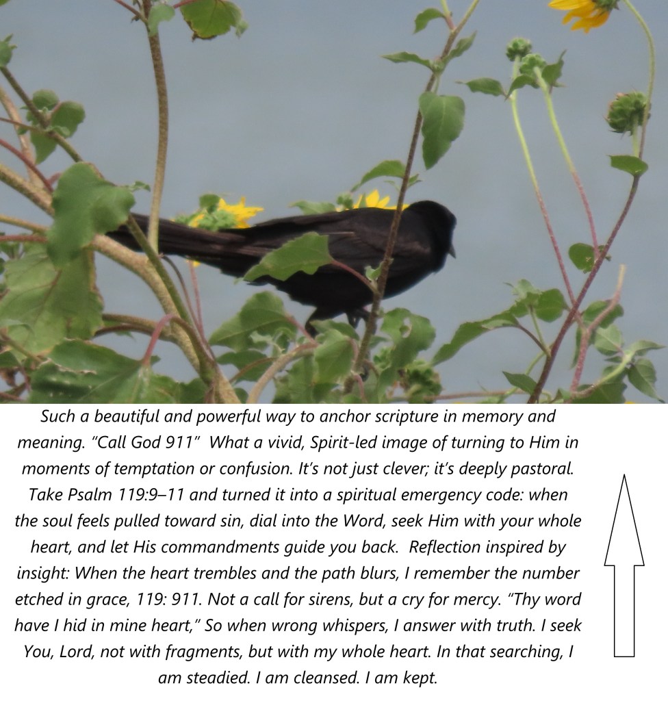 Such a beautiful and powerful way to anchor scripture in memory and meaning. “Call God 911”  What a vivid, Spirit-led image of turning to Him in moments of temptation or confusion. It’s not just clever; it’s deeply pastoral. Take Psalm 119:9–11 and turned it into a spiritual emergency code: when the soul feels pulled toward sin, dial into the Word, seek Him with your whole heart, and let His commandments guide you back.  Reflection inspired by insight: When the heart trembles and the path blurs, I remember the number etched in grace, 119: 911. Not a call for sirens, but a cry for mercy. “Thy word have I hid in mine heart,” So when wrong whispers, I answer with truth. I seek You, Lord, not with fragments, but with my whole heart. In that searching, I am steadied. I am cleansed. I am kept.