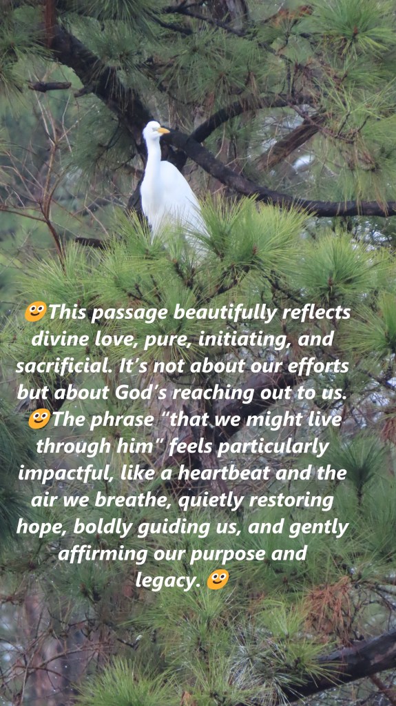 ๐This passage beautifully reflects divine love, pure, initiating, and sacrificial. Itโs not about our efforts but about Godโs reaching out to us. ๐The phrase โthat we might live through himโ feels particularly impactful, like a heartbeat and the air we breathe, quietly restoring hope, boldly guiding us, and gently affirming our purpose and legacy.๐