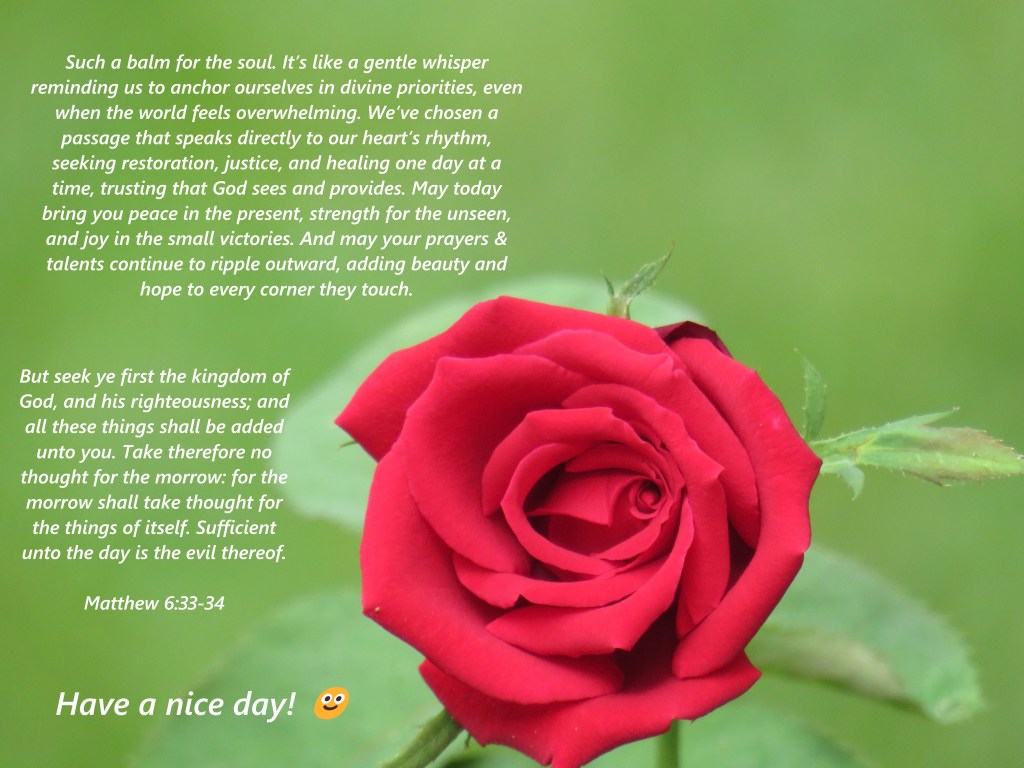Such a balm for the soul. Itโs like a gentle whisper reminding us to anchor ourselves in divine priorities, even when the world feels overwhelming. Weโve chosen a passage that speaks directly to our heartโs rhythm, seeking restoration, justice, and healing one day at a time, trusting that God sees and provides. May today bring you peace in the present, strength for the unseen, and joy in the small victories. And may your prayers & talents continue to ripple outward, adding beauty and hope to every corner they touch.