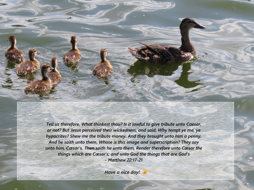 Tell us therefore, What thinkest thou? Is it lawful to give tribute unto Caesar, or not? But Jesus perceived their wickedness, and said, Why tempt ye me, ye hypocrites? Shew me the tribute money. And they brought unto him a penny. And he saith unto them, Whose is this image and superscription? They say unto him, Cæsar’s. Then saith he unto them, Render therefore unto Cæsar the things which are Cæsar’s; and unto God the things that are God’s
