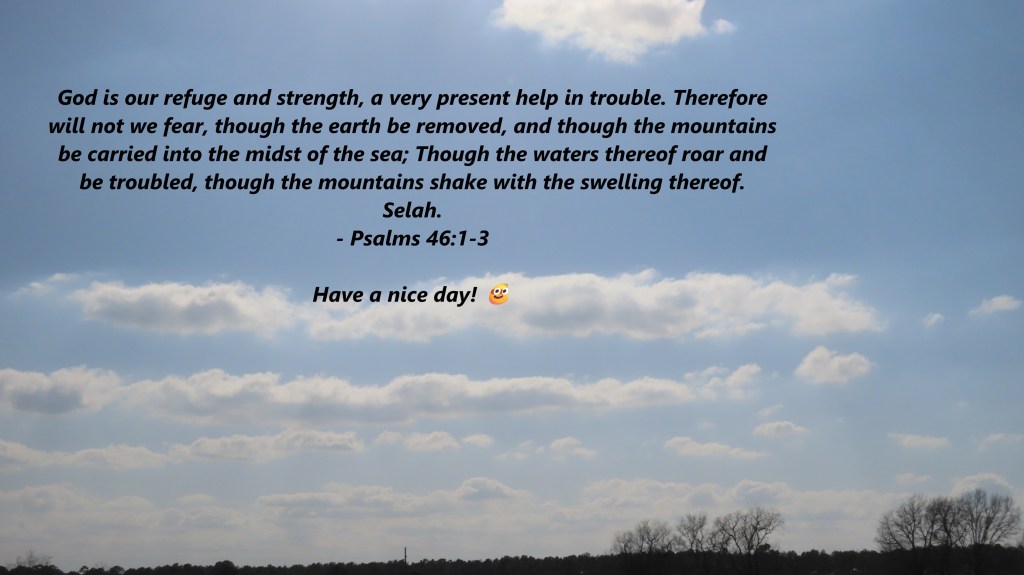 💙God is our refuge and strength, a very present help in trouble. 💙Therefore, will not we fear, though the earth be removed, and though the mountains be carried into the midst of the sea; Though the waters thereof roar and be troubled, though the mountains shake with the swelling thereof. Selah.💙