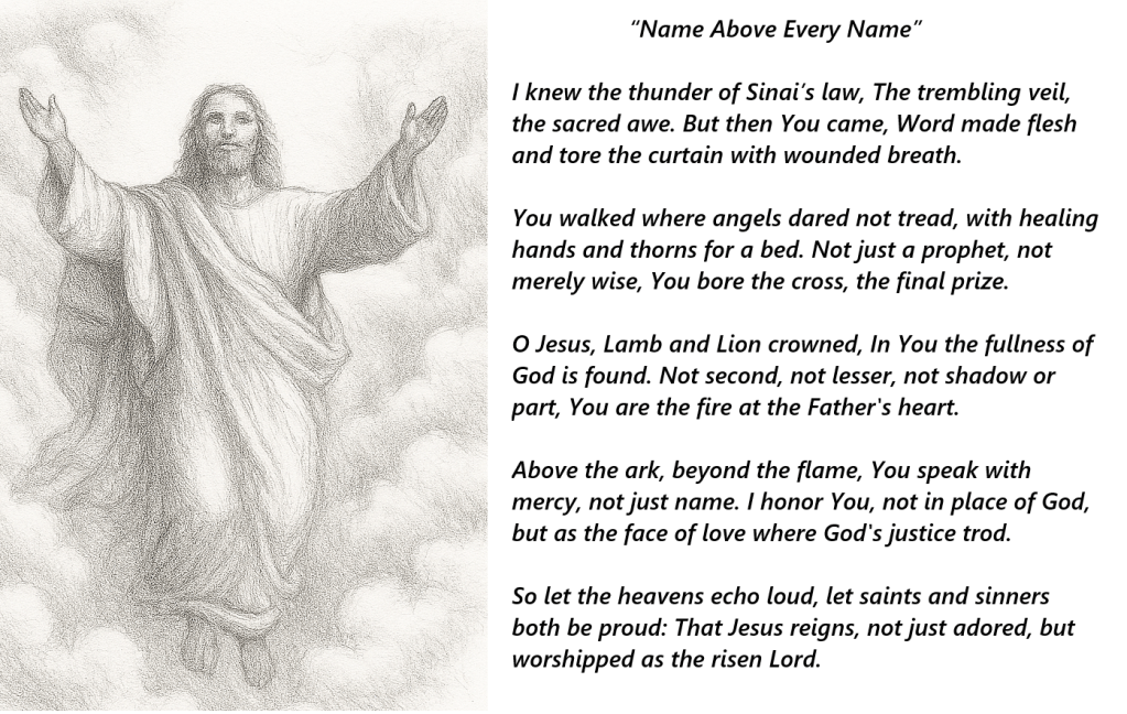 Above the ark, beyond the flame, You speak with mercy, not just name. I honor You, not in place of God, but as the face of love where justice trod.