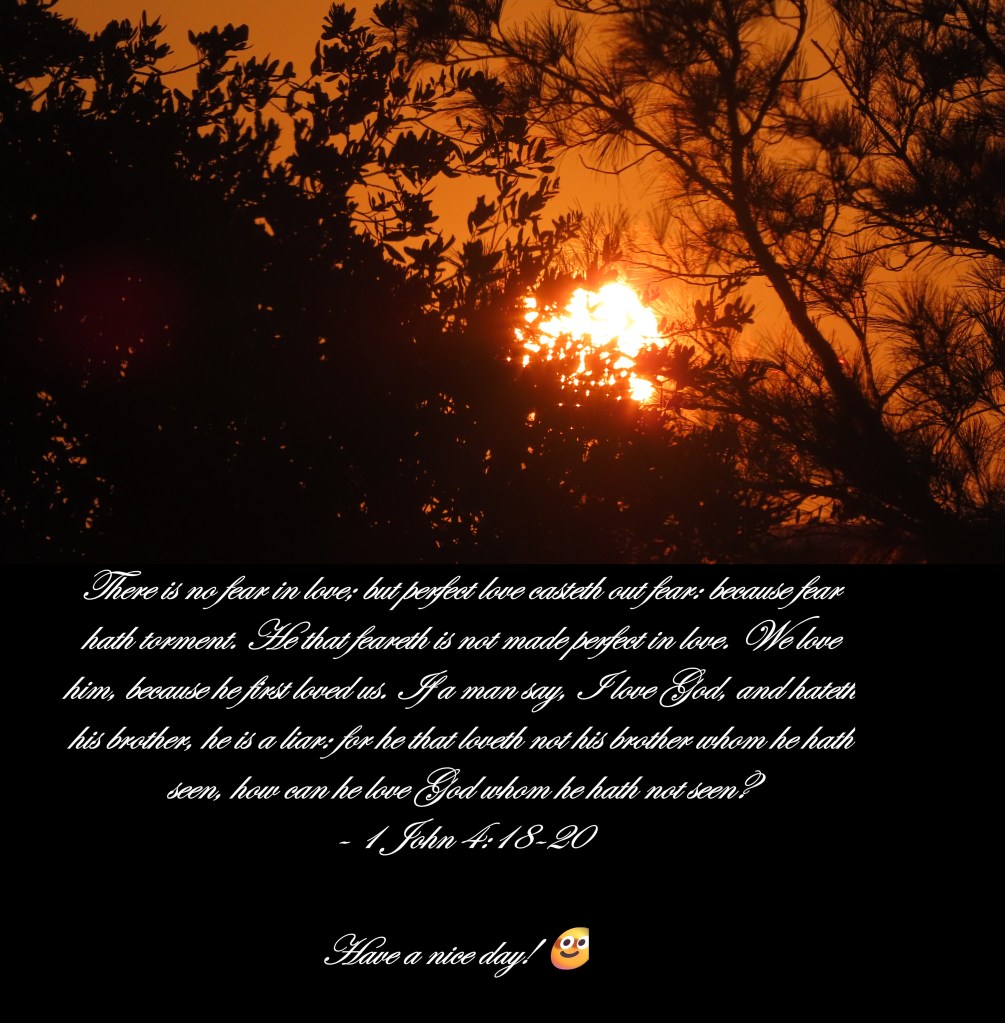 There is no fear in love; but perfect love casteth out fear: because fear hath torment. He that feareth is not made perfect in love. We love him, because he first loved us. If a man say, I love God, and hateth his brother, he is a liar: for he that loveth not his brother whom he hath seen, how can he love God whom he hath not seen?