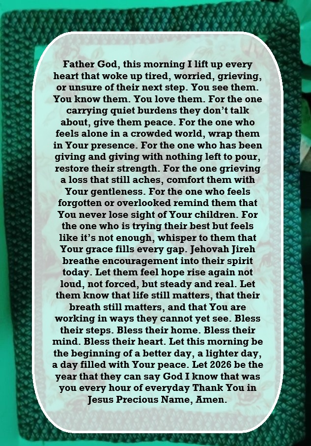 Father God, this morning I lift up every heart that woke up tired, worried, grieving, or unsure of their next step. You see them. You know them. You love them. For the one carrying quiet burdens they don’t talk about, give them peace. For the one who feels alone in a crowded world, wrap them in Your presence. For the one who has been giving and giving with nothing left to pour, restore their strength. For the one grieving a loss that still aches, comfort them with Your gentleness. For the one who feels forgotten or overlooked remind them that You never lose sight of Your children. For the one who is trying their best but feels like it’s not enough, whisper to them that Your grace fills every gap. Jehovah Jireh breathe encouragement into their spirit today. Let them feel hope rise again not loud, not forced, but steady and real. Let them know that life still matters, that their breath still matters, and that You are working in ways they cannot yet see. Bless their steps. Bless their home. Bless their mind. Bless their heart. Let this morning be the beginning of a better day, a lighter day, a day filled with Your peace. Let 2026 be the year that they can say God I know that was you every hour of everyday Thank You in Jesus Precious Name, Amen.