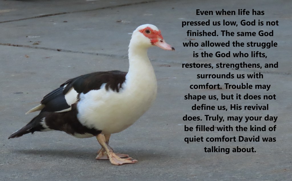 Even when life has pressed us low, God is not finished. The same God who allowed the struggle is the God who lifts, restores, strengthens, and surrounds us with comfort. Trouble may shape us, but it does not define us, His revival does. Truly, may your day be filled with the kind of quiet comfort David was talking about.