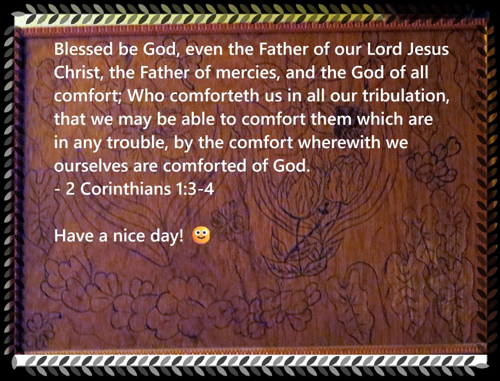 Blessed be God, even the Father of our Lord Jesus Christ, the Father of mercies, and the God of all comfort; Who comforteth us in all our tribulation, that we may be able to comfort them which are in any trouble, by the comfort wherewith we ourselves are comforted of God.