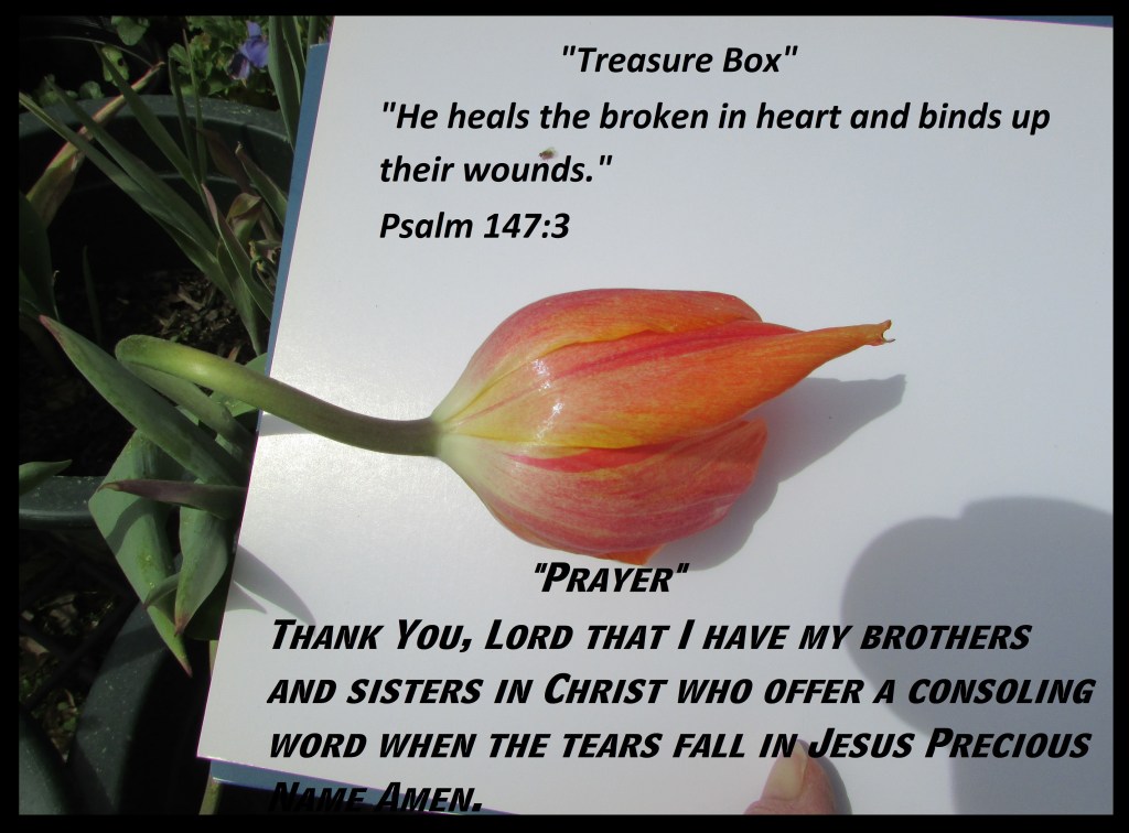 “He heals the broken in heart and binds up their wounds.” Psalm 147:3 “Prayer” Thank You, Lord that I have my brothers and sisters in Christ who offer a consoling word when the tears fall in Jesus Precious Name Amen.