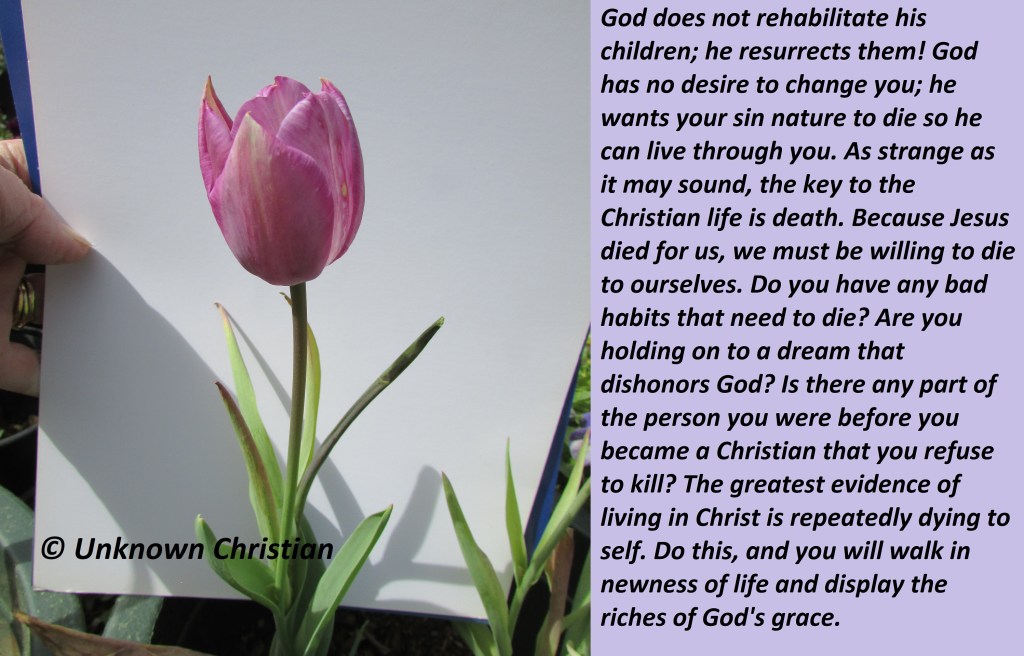 God does not rehabilitate his children; he resurrects them! God has no desire to change you; he wants your sin nature to die so he can live through you. As strange as it may sound, the key to the Christian life is death. Because Jesus died for us, we must be willing to die to ourselves. Do you have any bad habits that need to die? Are you holding on to a dream that dishonors God? Is there any part of the person you were before you became a Christian that you refuse to kill? The greatest evidence of living in Christ is repeatedly dying to self. Do this, and you will walk in newness of life and display the riches of God’s grace.