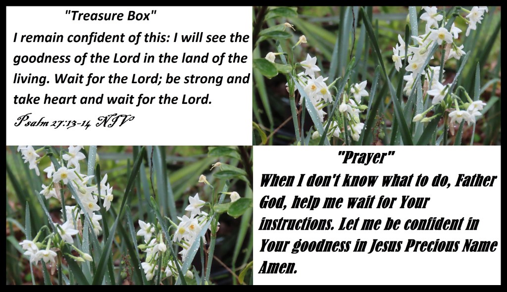 I remain confident of this: I will see the goodness of the Lord in the land of the living. Wait for the Lord; be strong and take heart and wait for the Lord. Psalm 27:13-14 NIV “Prayer” When I don’t know what to do, Father God, help me wait for Your instructions. Let me be confident in Your goodness in Jesus Precious Name Amen.