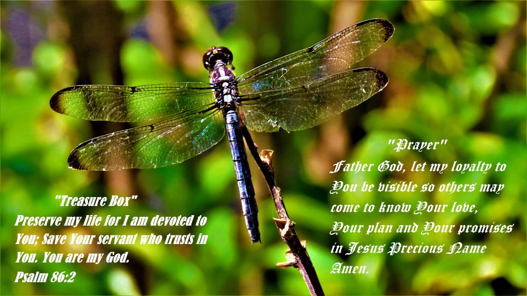 Preserve my life for I am devoted to You; Save Your servant who trusts in You. You are my God. Psalm 86:2 “Prayer” Father God, let my loyalty to You be visible so others may come to know Your love, Your plan and Your promises in Jesus Precious Name Amen.