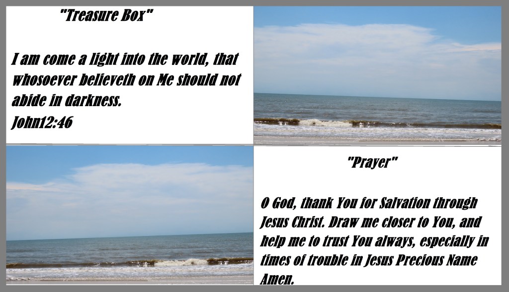 I am come a light into the world, that whosoever believeth on Me should not abide in darkness. John12:46 “Prayer” O God, thank You for Salvation through Jesus Christ. Draw me closer to You, and help me to trust You always, especially in times of trouble in Jesus Precious Name Amen.