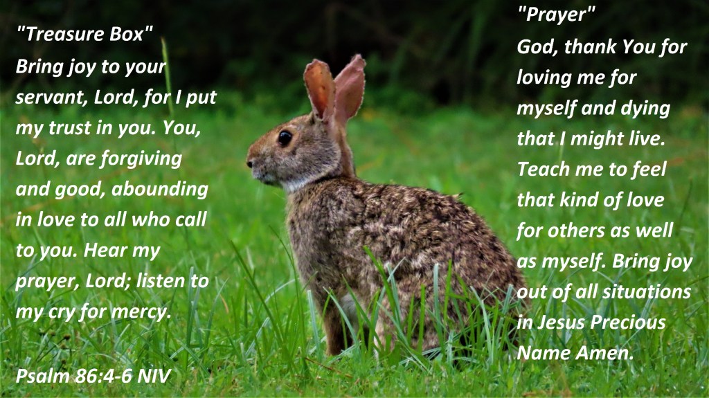 God, thank You for loving me for myself and dying that I might live. Teach me to feel that kind of love for others as well as myself. Bring joy out of all situations in Jesus Precious Name Amen.