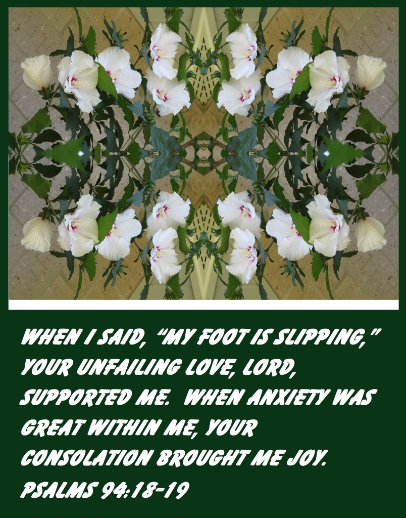 When I said, “My foot is slipping,” your unfailing love, LORD, supported me. When anxiety was great within me, your consolation brought me joy.