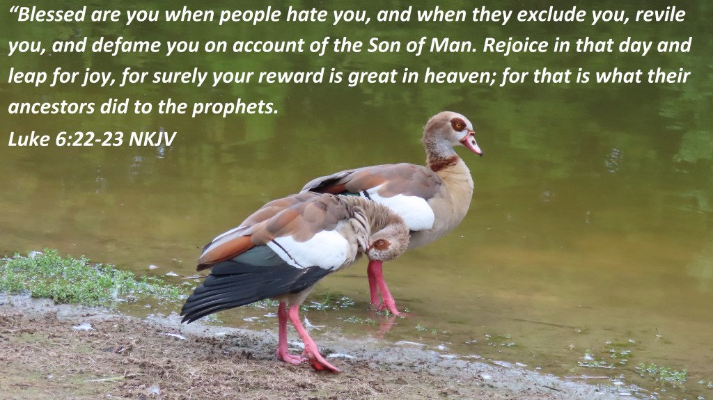 “Blessed are you when people hate you, and when they exclude you, revile you, and defame you on account of the Son of Man. Rejoice in that day and leap for joy, for surely your reward is great in heaven; for that is what their ancestors did to the prophets. Luke 6:22-23 NKJV Lord, help us to forgive, pray for everyone, thank You in everything and put a new joy in our living in Jesus Precious Name Amen.