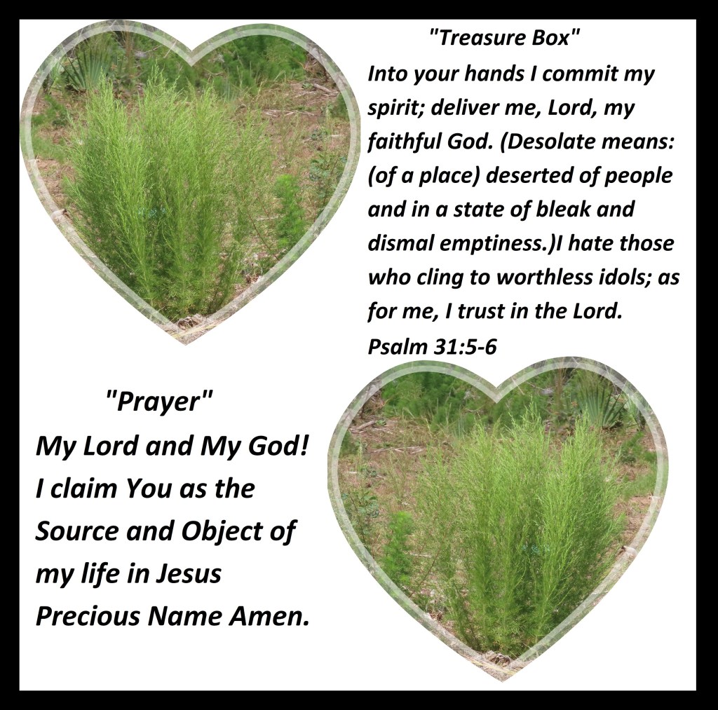 Into your hands I commit my spirit; deliver me, Lord, my faithful God. (Desolate means: (of a place) deserted of people and in a state of bleak and dismal emptiness.)I hate those who cling to worthless idols; as for me, I trust in the Lord. Psalm 31:5-6 “Prayer” My Lord and My God! I claim You as the Source and Object of my life in Jesus Precious Name Amen.