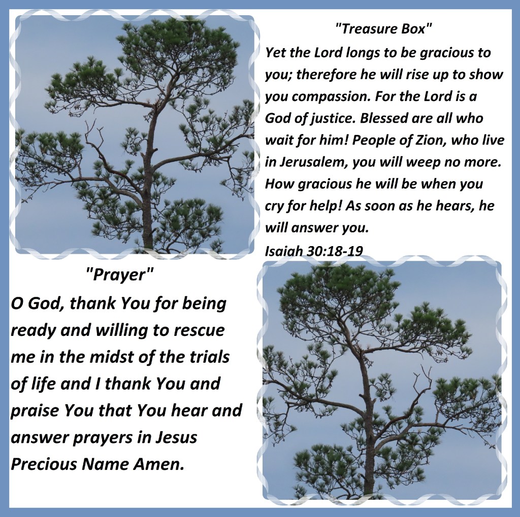 Yet the Lord longs to be gracious to you; therefore he will rise up to show you compassion. For the Lord is a God of justice. Blessed are all who wait for him! People of Zion, who live in Jerusalem, you will weep no more. How gracious he will be when you cry for help! As soon as he hears, he will answer you. Isaiah 30:18-19 “Prayer” O God, thank You for being ready and willing to rescue me in the midst of the trials of life and I thank You and praise You that You hear and answer prayers in Jesus Precious Name Amen.