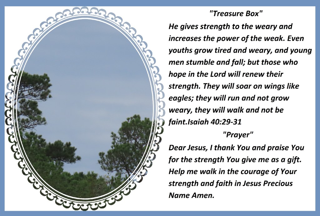 “Prayer” Dear Jesus, I thank You and praise You for the strength You give me as a gift. Help me walk in the courage of Your strength and faith in Jesus Precious Name Amen.