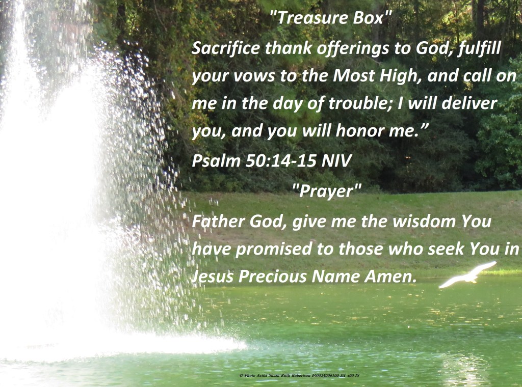 Sacrifice thank offerings to God, fulfill your vows to the Most-High, and call on me in the day of trouble; I will deliver you, and you will honor me.” Psalm 50:14-15 NIV Father God, give me the wisdom You have promised to those who seek You in Jesus Precious Name Amen.