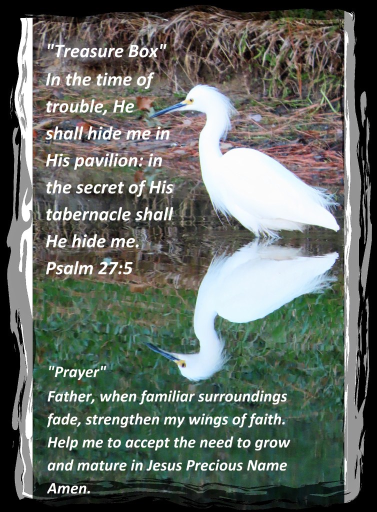 In the time of trouble, He shall hide me in His pavilion: in the secret of His tabernacle shall He hide me. Psalm 27:5 “Prayer” Father, when familiar surroundings fade, strengthen my wings of faith. Help me to accept the need to grow and mature in Jesus Precious Name Amen.