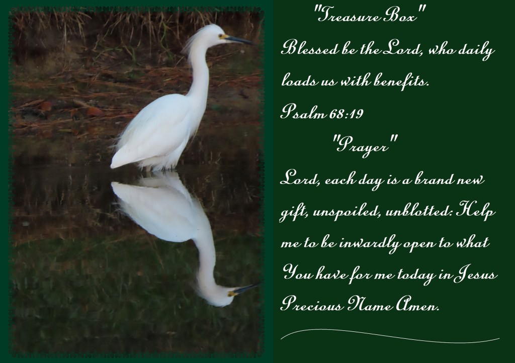 Blessed be the Lord, who daily loads us with benefits. Psalm 68:19 “Prayer” Lord, each day is a brand new gift, unspoiled, unblotted: Help me to be inwardly open to what You have for me today in Jesus Precious Name Amen.