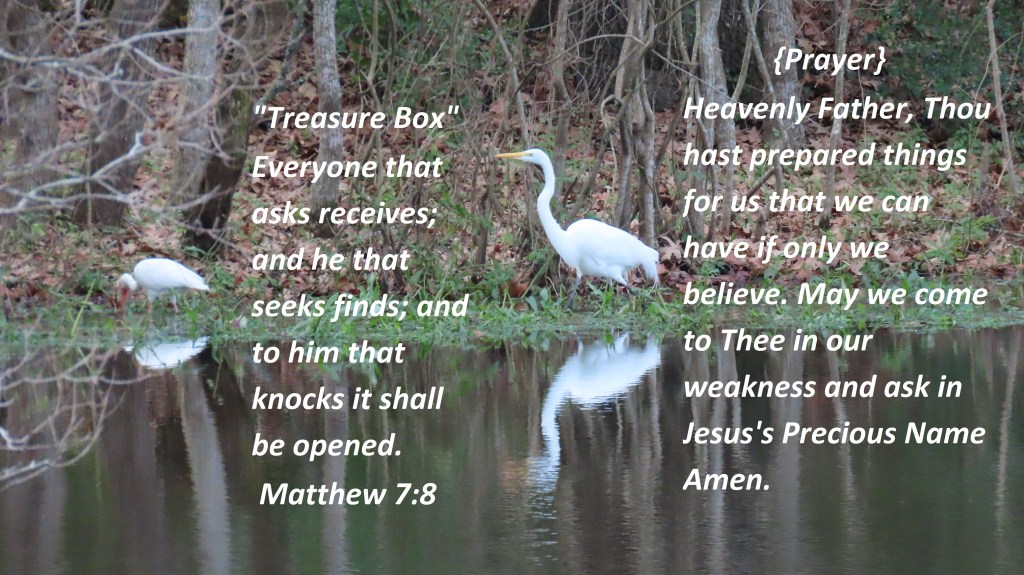 Everyone that asks receives; and he that seeks finds; and to him that knocks it shall be opened. Matthew 7:8 {Prayer} Heavenly Father, You, have prepared things for us that we can have if only we believe. May we come to Thee in our weakness and ask in Jesus’s Precious Name Amen.