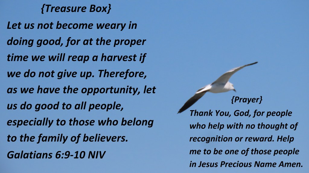 Let us not become weary in doing good, for at the proper time we will reap a harvest if we do not give up. Therefore, as we have opportunity, let us do good to all people, especially to those who belong to the family of believers. Galatians 6:9-10 NIV {Prayer} Thank You, God, for people who help with no thought of recognition or reward. Help me to be one of those people in Jesus Precious Name Amen.