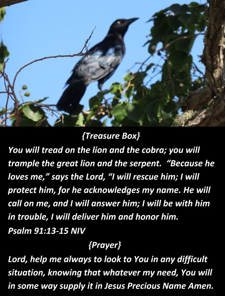 You will tread on the lion and the cobra; you will trample the great lion and the serpent. “Because he loves me,” says the Lord, “I will rescue him; I will protect him, for he acknowledges my name. He will call on me, and I will answer him; I will be with him in trouble, I will deliver him and honor him. Psalm 91:13-15 NIV {Prayer} Lord, help me always to look to You in any difficult situation, knowing that whatever my need, You will in some way supply it in Jesus Precious Name Amen.
