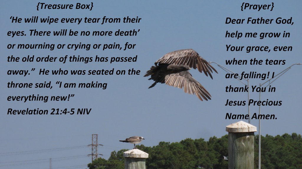 ‘He will wipe every tear from their eyes. There will be no more death’ or mourning or crying or pain, for the old order of things has passed away.” He who was seated on the throne said, “I am making everything new!” Revelation 21:4-5 NIV {Prayer} Dear Father God, help me grow in Your grace, even when the tears are falling! I thank You in Jesus Precious Name Amen.
