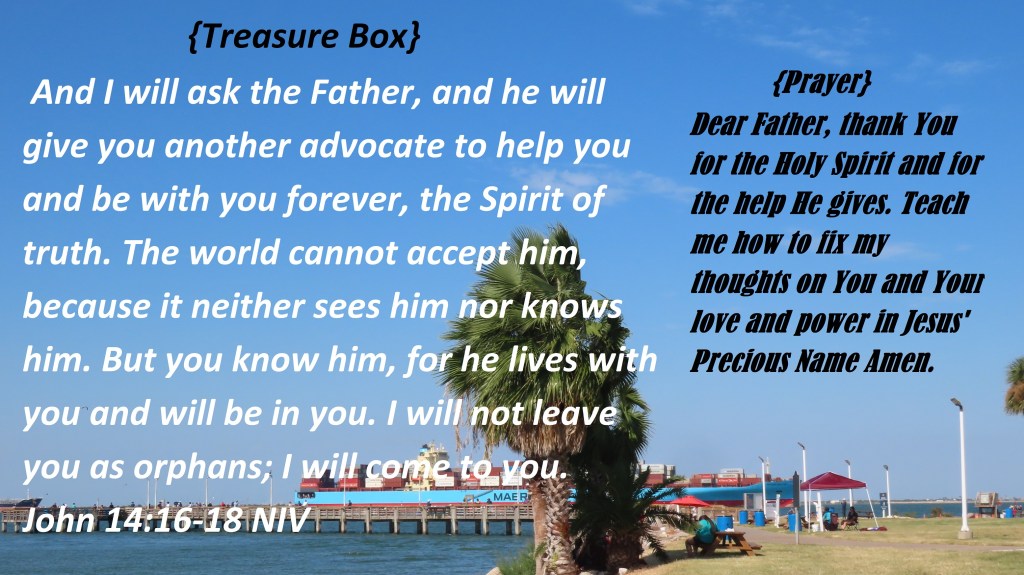 And I will ask the Father, and he will give you another advocate to help you and be with you forever, the Spirit of truth. The world cannot accept him, because it neither sees him nor knows him. But you know him, for he lives with you and will be in you. I will not leave you as orphans; I will come to you. John 14:16-18 NIV {Prayer} Dear Father, thank You for the Holy Spirit and for the help He gives. Teach me how to fix my thoughts on You and Your love and power in Jesus’ Precious Name Amen.