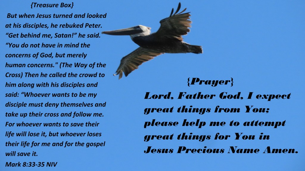 But when Jesus turned and looked at his disciples, he rebuked Peter. “Get behind me, Satan!” he said. “You do not have in mind the concerns of God, but merely human concerns.” (The Way of the Cross) Then he called the crowd to him along with his disciples and said: “Whoever wants to be my disciple must deny themselves and take up their cross and follow me. For whoever wants to save their life will lose it, but whoever loses their life for me and for the gospel will save it. Mark 8:33-35 NIV {Prayer} Lord, Father God, I expect great things from You; please help me to attempt great things for You in Jesus Precious Name Amen.