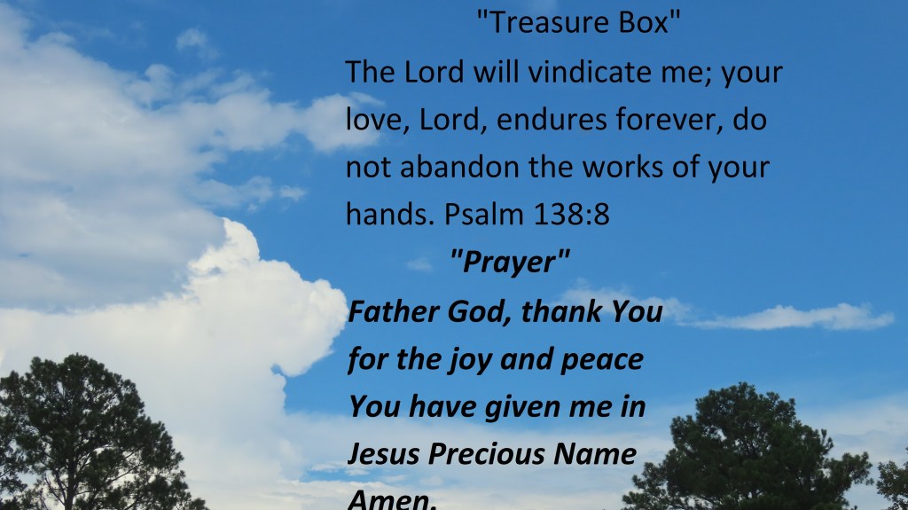 Father God, thank You for the joy and peace You have given me in Jesus Precious Name Amen.