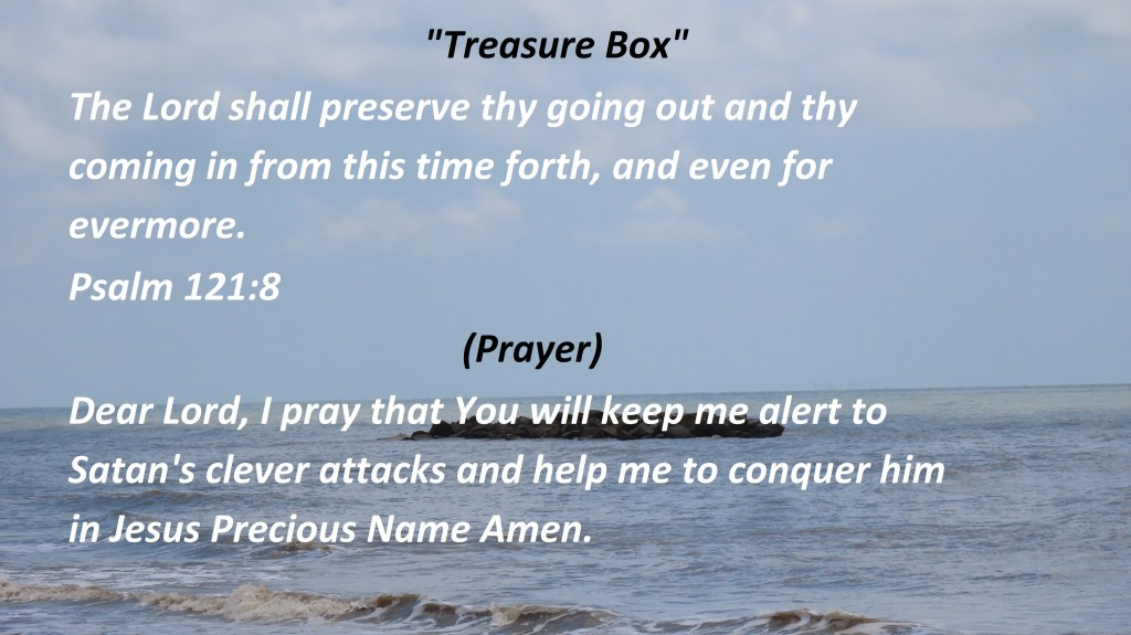 The Lord shall preserve thy going out and thy coming in from this time forth, and even for evermore. Psalm 121:8 (Prayer) Dear Lord, I pray that You will keep me alert to Satan’s clever attacks and help me to conquer him in Jesus Precious Name Amen.