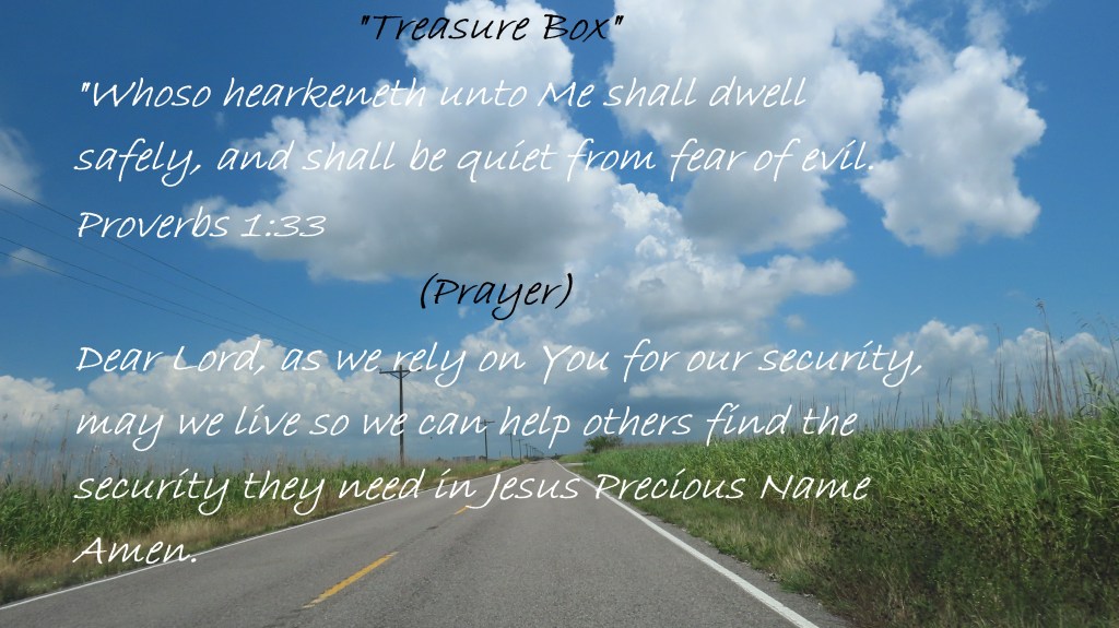 “Whoso hearkeneth unto Me shall dwell safely, and shall be quiet from fear of evil. Proverbs 1:33 (Prayer) Dear Lord, as we rely on You for our security, may we live so we can help others find the security they need in Jesus Precious Name Amen.