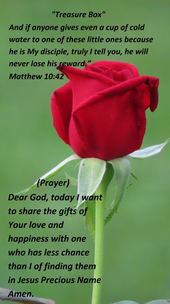 And if anyone gives even a cup of cold water to one of these little ones because he is My disciple, truly I tell you, he will never lose his reward.” Matthew 10:42 (Prayer) Dear God, today I want to share the gifts of Your love and happiness with one who has less chance than I of finding them in Jesus Precious Name Amen.