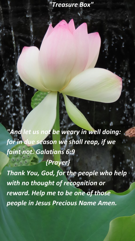 “And let us not be weary in well doing for in due season we shall reap, if we faint not. Galatians 6:9 {Prayer} Thank You, God, for the people who help with no thought of recognition or reward. Help me to be one of those people in Jesus Precious Name Amen.
