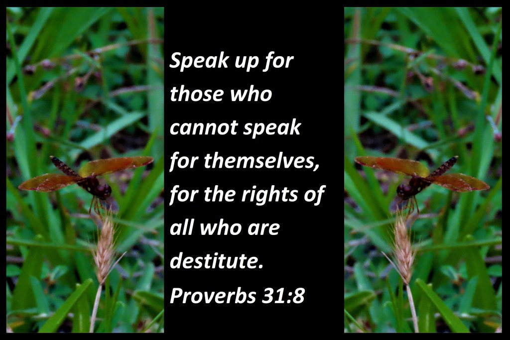 {Power Verse} Speak up for those who cannot speak for themselves, for the rights of all who are destitute. Proverbs 31:8