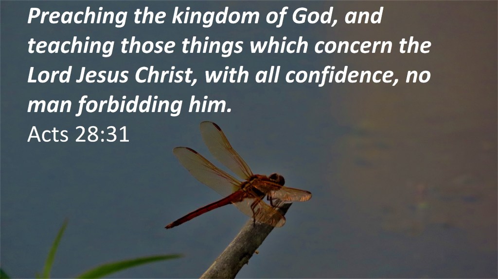 Preaching the kingdom of God, and teaching those things which concern the Lord Jesus Christ, with all confidence, no man forbidding him. Acts 28:31