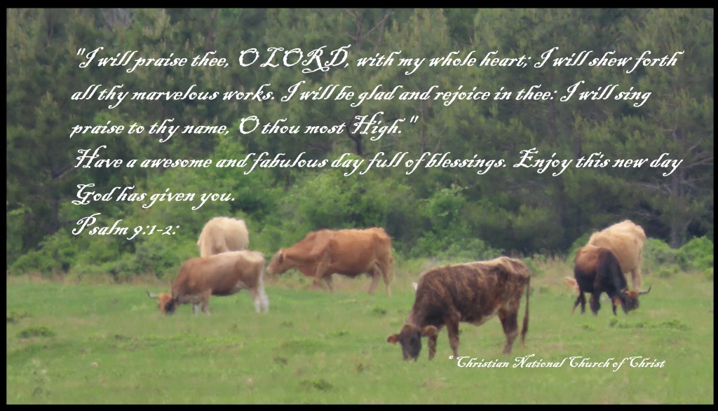 Psalm 9:1-2: “I will praise thee, O LORD, with my whole heart; I will shew forth all thy marvelous works. I will be glad and rejoice in thee: I will sing praise to thy name, O thou most High.” Have a awesome and fabulous day full of blessings. Enjoy this new day God has given you.