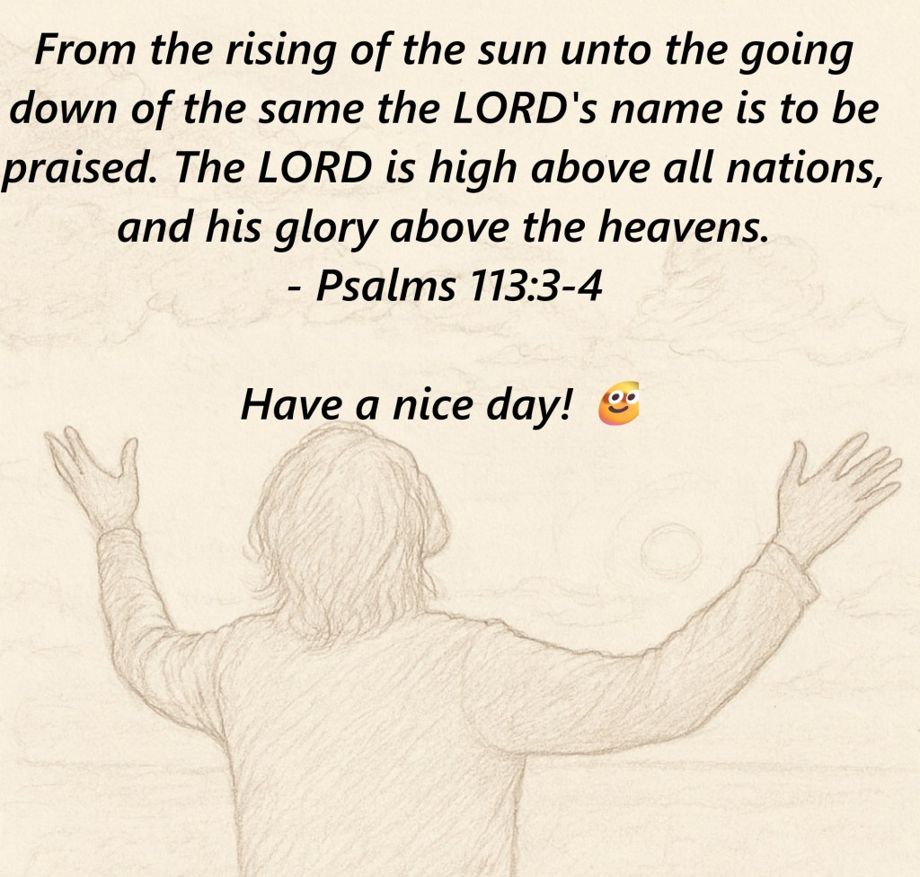 This is such a beautiful verse. Psalms 113 reminds us that God’s glory isn’t bound by time or place. His name is worthy of praise from sunrise to sunset, across every nation. It’s a call to live in continual worship, letting gratitude and reverence shape the rhythm of our day. I love how it pairs the vastness of creation (“above the heavens”) with the intimacy of daily life (“from the rising of the sun”). It’s both cosmic and personal. It’s like a reminder that every moment, whether ordinary or extraordinary, can be an offering of praise.