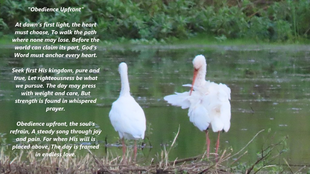 Obedience upfront, the soul’s refrain, a steady song through joy and pain. For when His will is placed above, the day is framed in endless love.