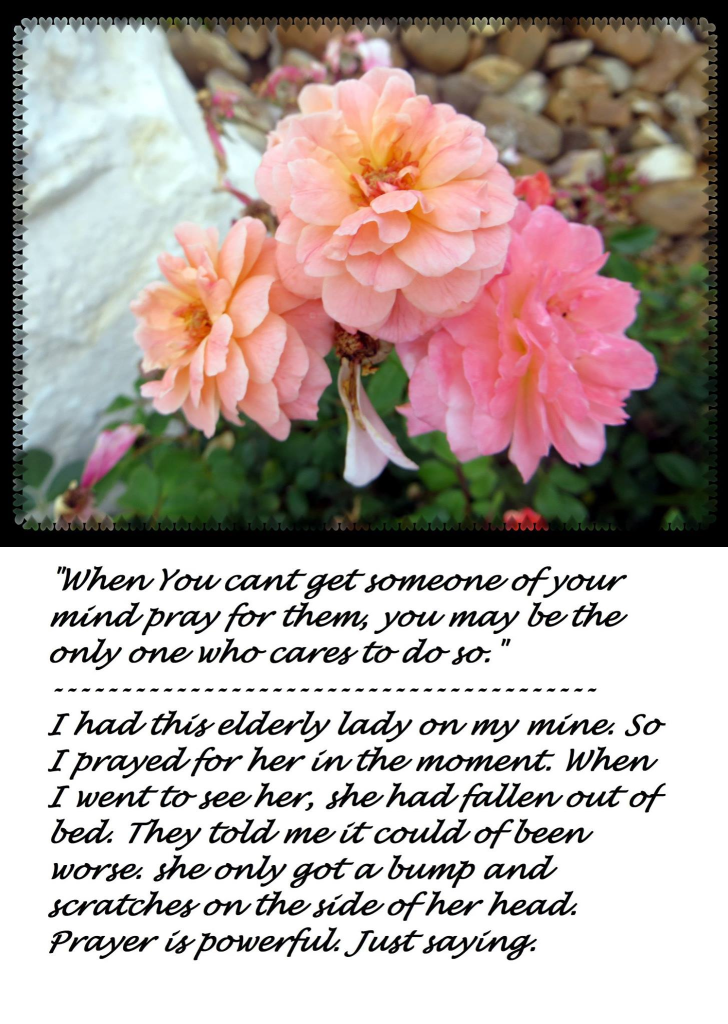 I had this elderly lady on my mine. So I prayed for her in the moment. When I went to see her, she had fallen out of bed. They told me it could of been worse. She only got a bump and scratches on the side of her head. Prayer is powerful. Just saying.