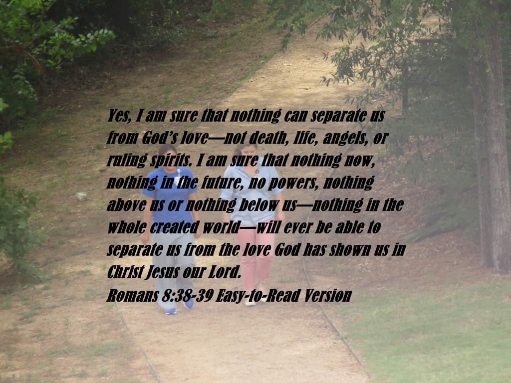 Yes, I am sure that nothing can separate us from God’s love—not death, life, angels, or ruling spirits. I am sure that nothing now, nothing in the future, no powers, nothing above us or nothing below us—nothing in the whole created world—will ever be able to separate us from the love God has shown us in Christ Jesus our Lord. Romans 8:38-39 Easy-to-Read Version